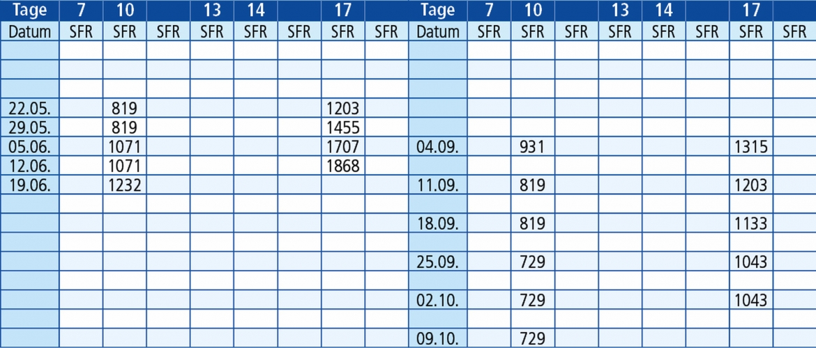 Freitag: 22.05. / 29.05. / 05.06. / 12.06. / 19.06. / 04.09. / 11.09. / 18.09. / 25.09. / 02.10. / 09.10. /