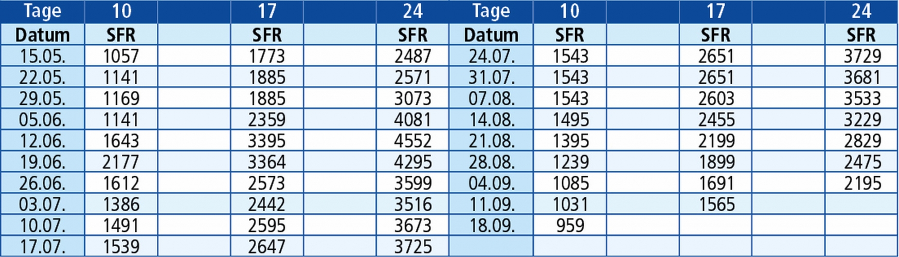 Rechnen Sie die Tage immer mit Abfahrtstag und Ankunftstag, so können Sie ausrechnen wann genau Sie wieder zu Hause ankommen. In den Preisen sind die Anzahl Nächte plus 1 Hin- und 1 Rückreise berechnet. Diese Berechnung gilt für Nachtfahrten.