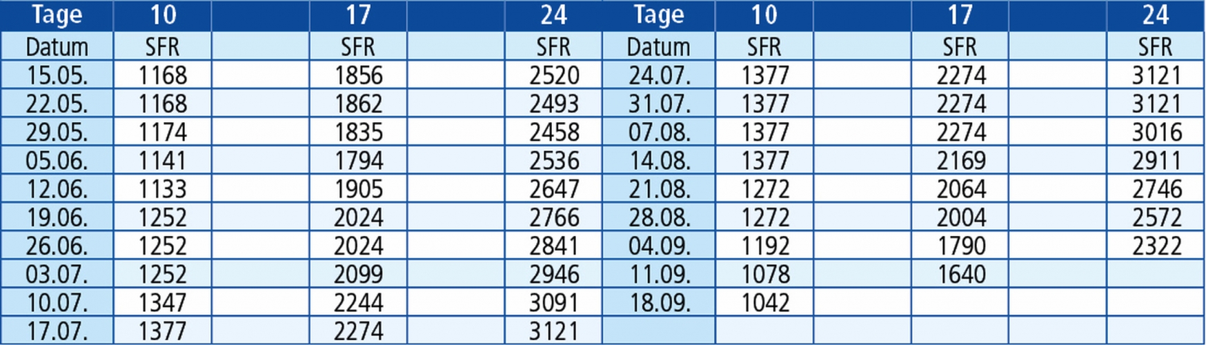Rechnen Sie die Tage immer mit Abfahrtstag und Ankunftstag, so können Sie ausrechnen wann genau Sie wieder zu Hause ankommen. In den Preisen sind die Anzahl Nächte plus 1 Hin- und 1 Rückreise berechnet. Diese Berechnung gilt für Nachtfahrten.