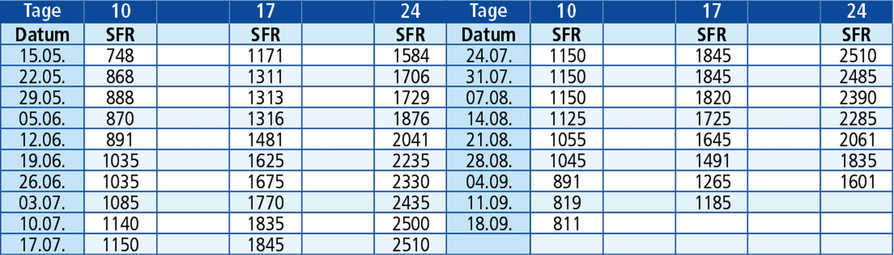 Bei 17 Tage Fahrt = 14 Übernachtungen am Ort, 15 Tage vor Ort, 1 Hin- und Rückreise