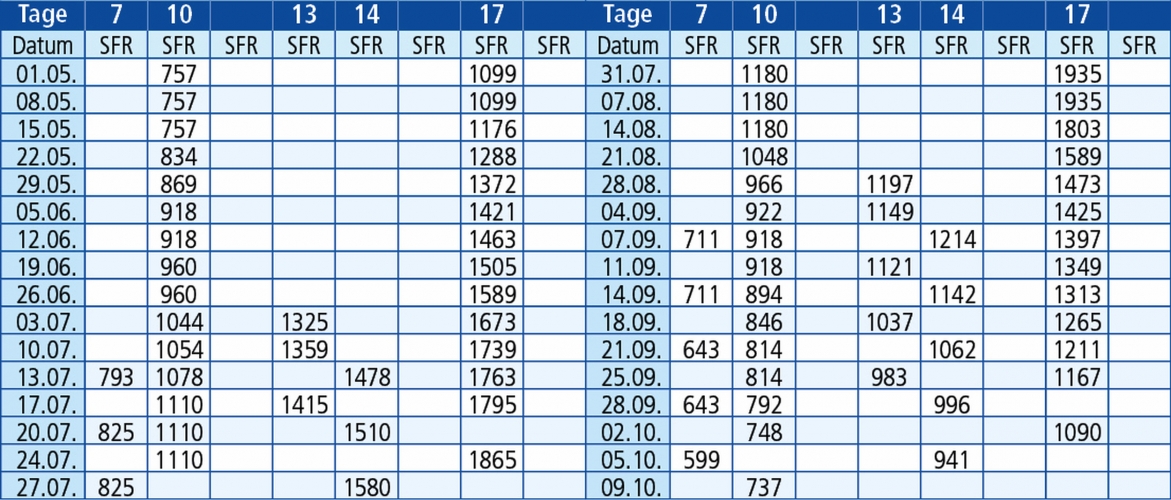 Bei 17 Tage Fahrt = 14 Übernachtungen am Ort, 15 Tage vor Ort, 1 Hin- und Rückreise