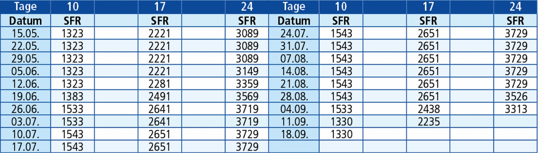 Bei 17 Tage Fahrt = 14 Übernachtungen am Ort, 15 Tage vor Ort, 1 Hin- und Rückreise