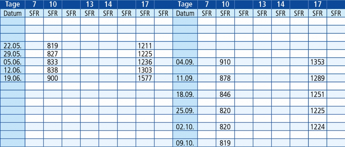 Freitag: 22.05. / 29.05. / 05.06. / 12.06. / 19.06. / 04.09. / 11.09. / 18.09. / 25.09. / 02.10. / 09.10. /