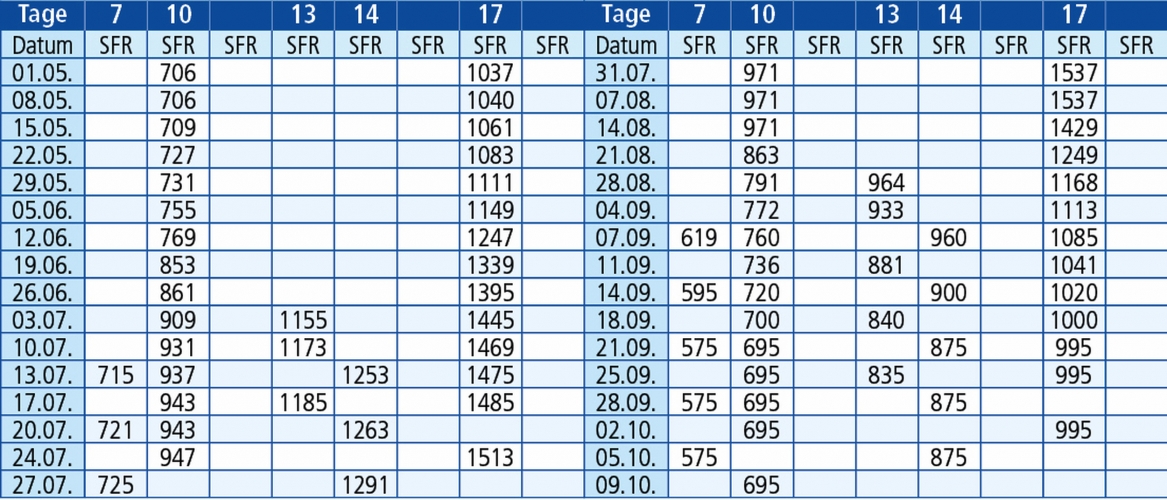 Hinfahrten: jeden Freitag 1.5. - 09.10.26
