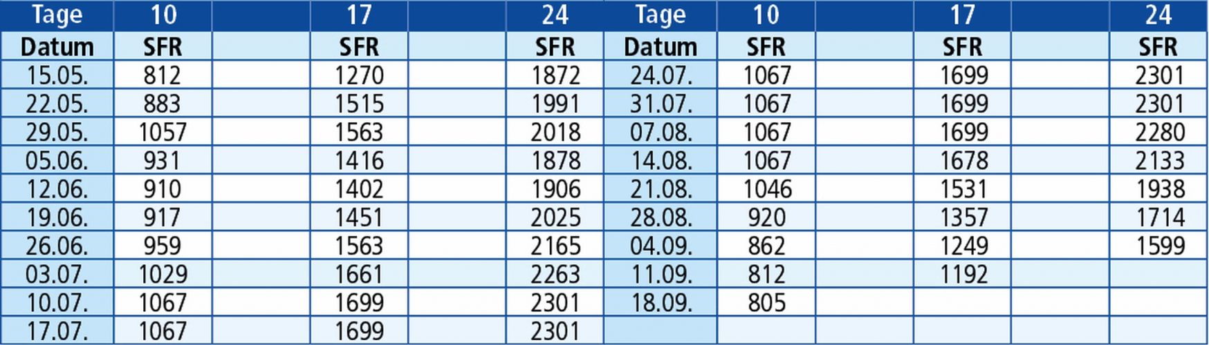 Rechnen Sie die Tage immer mit Abfahrtstag und Ankunftstag, so können Sie ausrechnen wann genau Sie wieder zu Hause ankommen. In den Preisen sind die Anzahl Nächte plus 1 Hin- und 1 Rückreise berechnet. Diese Berechnung gilt für Nachtfahrten.
