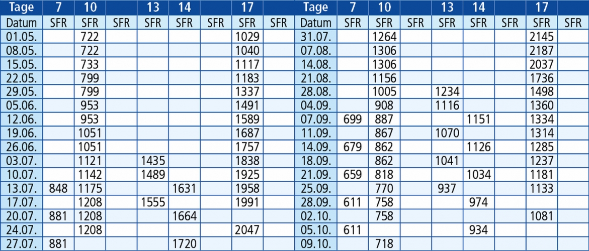 Bei 07 Tage Fahrt = 04 Übernachtungen am Ort, 05 Tage vor Ort, 1 Hin- und Rückreise