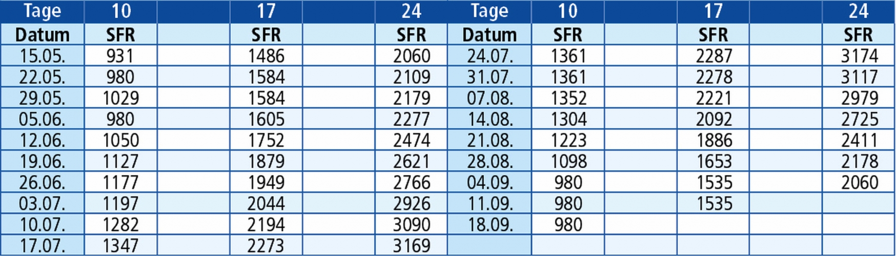 Rechnen Sie die Tage immer mit Abfahrtstag und Ankunftstag, so können Sie ausrechnen wann genau Sie wieder zu Hause ankommen. In den Preisen sind die Anzahl Nächte plus 1 Hin- und 1 Rückreise berechnet. Diese Berechnung gilt für Nachtfahrten.