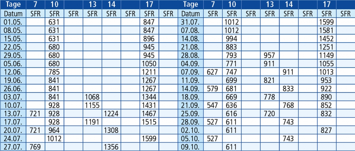 Rechnen Sie die Tage immer mit Abfahrtstag und Ankunftstag, so können Sie ausrechnen wann genau Sie wieder zu Hause ankommen. In den Preisen sind die Anzahl Nächte plus 1 Hin- und 1 Rückreise berechnet. Diese Berechnung gilt für Nachtfahrten.