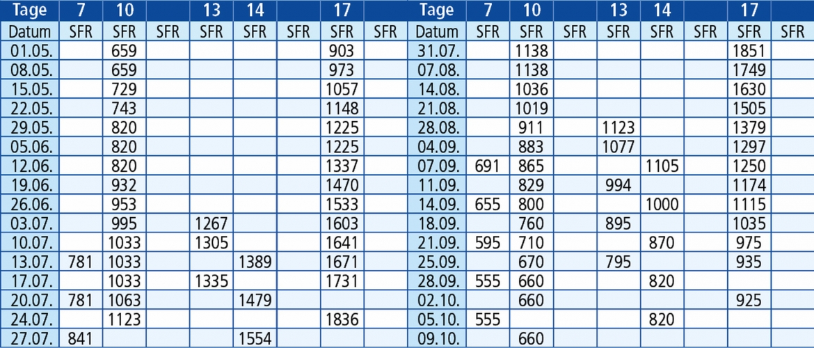 Rechnen Sie die Tage immer mit Abfahrtstag und Ankunftstag, so können Sie ausrechnen wann genau Sie wieder zu Hause ankommen. In den Preisen sind die Anzahl Nächte plus 1 Hin- und 1 Rückreise berechnet. Diese Berechnung gilt für Nachtfahrten.