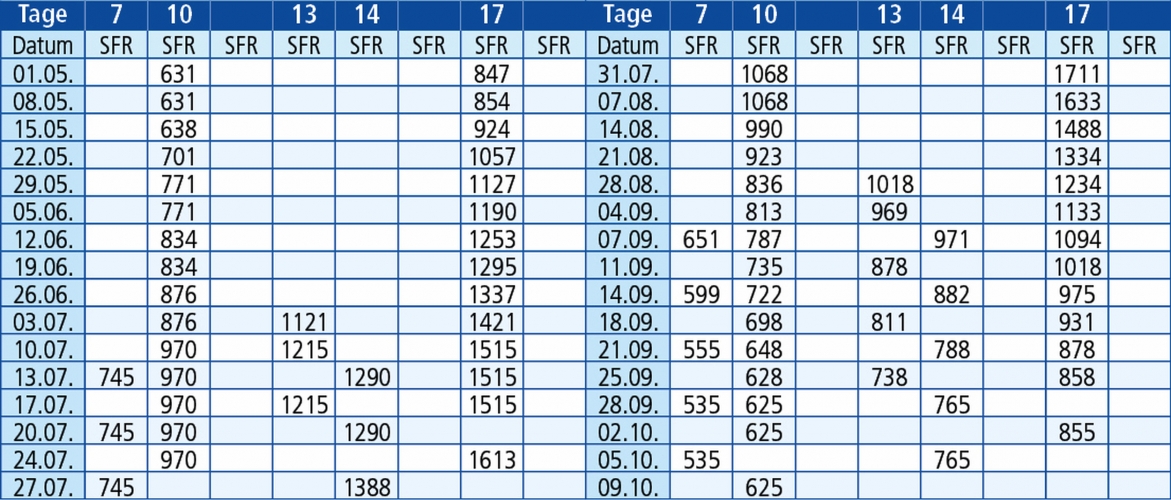 Bei 07 Tage Fahrt = 04 Übernachtungen am Ort, 05 Tage vor Ort, 1 Hin- und Rückreise