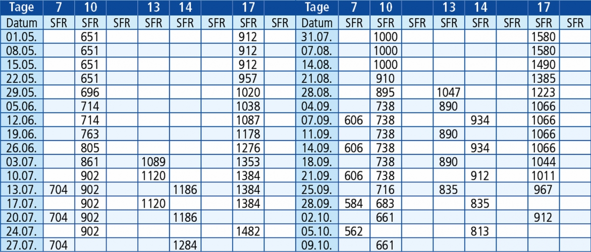 Rechnen Sie die Tage immer mit Abfahrtstag und Ankunftstag, so können Sie ausrechnen wann genau Sie wieder zu Hause ankommen. In den Preisen sind die Anzahl Nächte plus 1 Hin- und 1 Rückreise berechnet. Diese Berechnung gilt für Nachtfahrten.