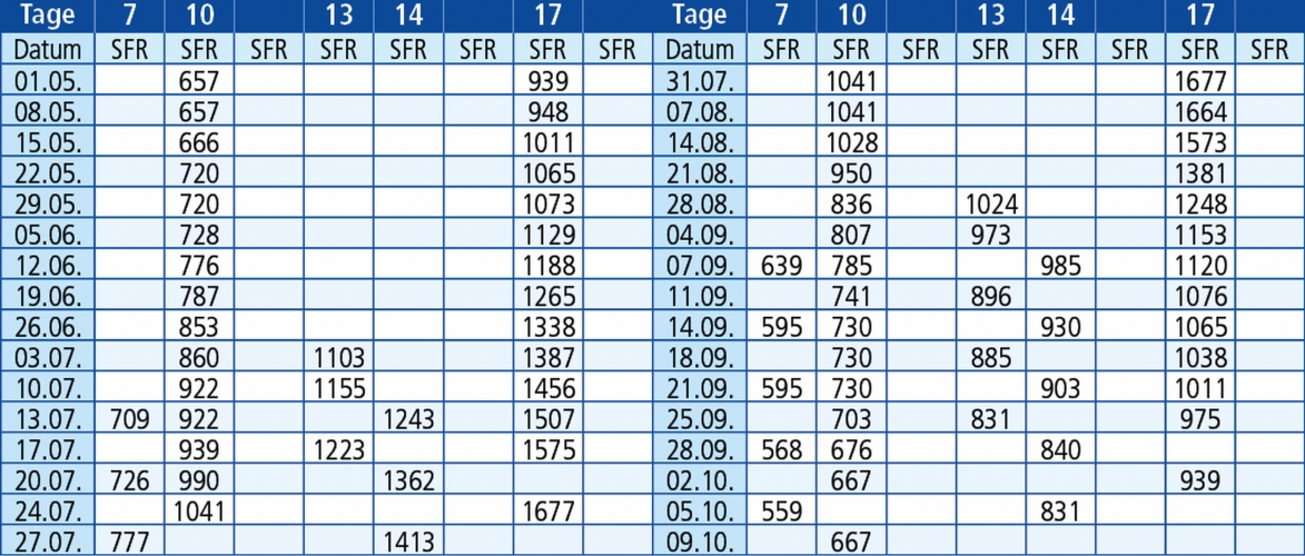 Rechnen Sie die Tage immer mit Abfahrtstag und Ankunftstag, so können Sie ausrechnen wann genau Sie wieder zu Hause ankommen. In den Preisen sind die Anzahl Nächte plus 1 Hin- und 1 Rückreise berechnet. Diese Berechnung gilt für Nachtfahrten.