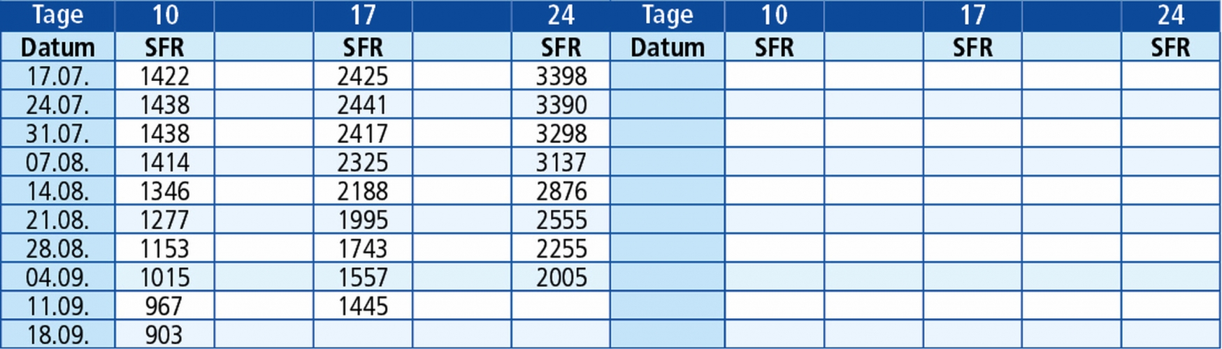 Bei 17 Tage Fahrt = 14 Übernachtungen am Ort, 15 Tage vor Ort, 1 Hin- und Rückreise