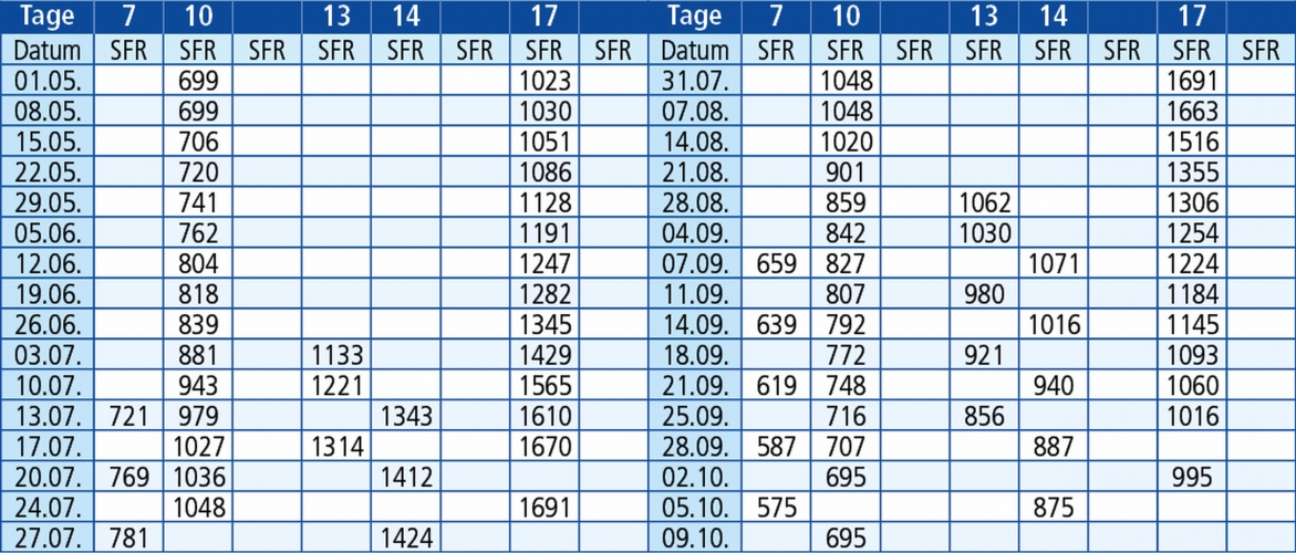 Bei 07 Tage Fahrt = 04 Übernachtungen am Ort, 05 Tage vor Ort, 1 Hin- und Rückreise