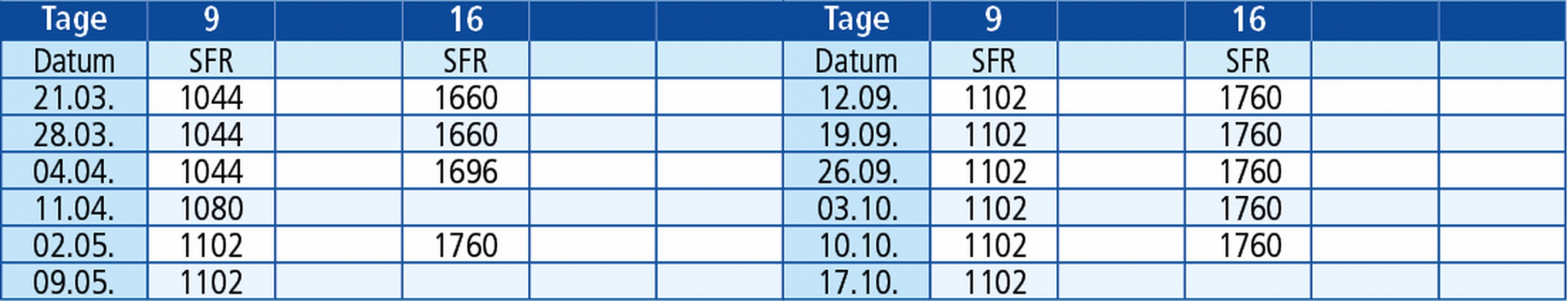 Rückfahrten Sonntag: 29.03. / 05.04. / 12.04. / 03.05. / 10.05. / 17.05. / 20.09. / 27.09. / 04.10. / 11.10. / 18.10. / 25.10. /