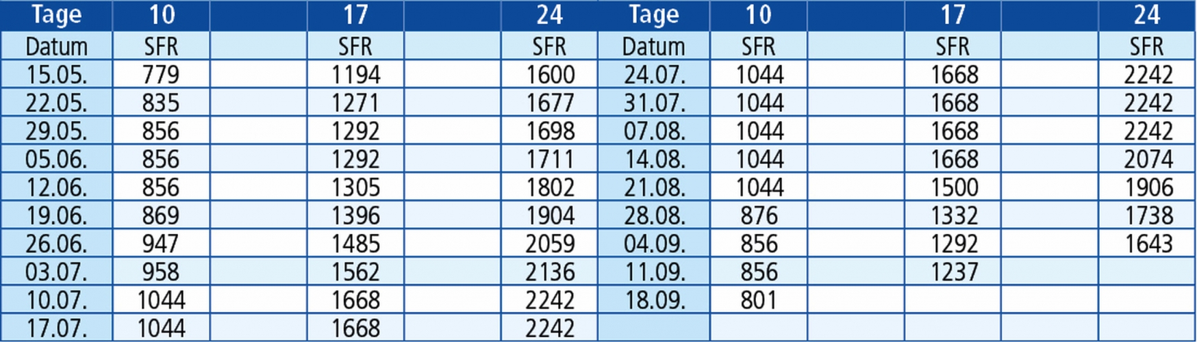 Rechnen Sie die Tage immer mit Abfahrtstag und Ankunftstag, so können Sie ausrechnen wann genau Sie wieder zu Hause ankommen. In den Preisen sind die Anzahl Nächte plus 1 Hin- und 1 Rückreise berechnet. Diese Berechnung gilt für Nachtfahrten.