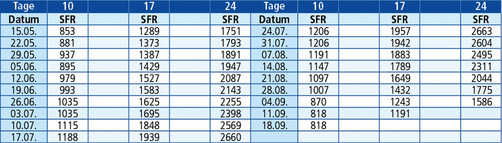 Bei 24 Tage Fahrt = 21 Übernachtungen am Ort, 22 Tage vor Ort, 1 Hin- und Rückreise
