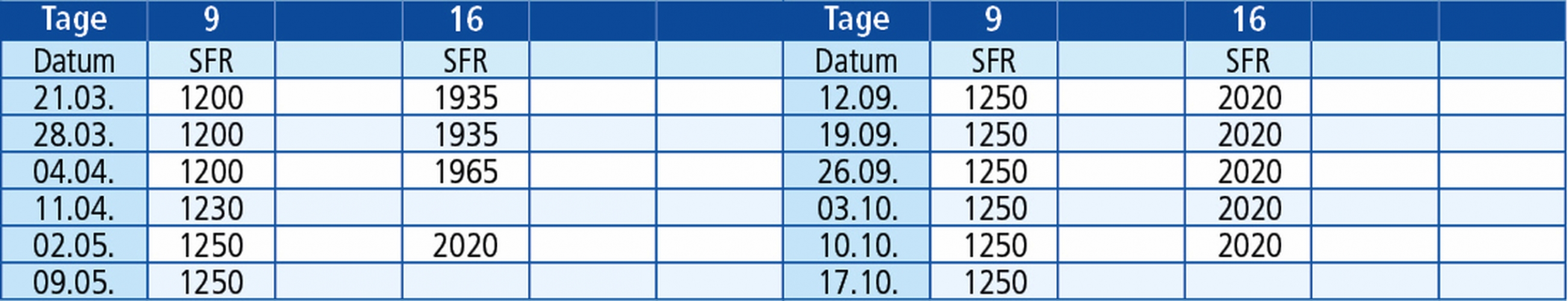 Hinfahrten Samstag: 21.03. / 28.03. / 04.04. / 11.04. / 02.05. / 09.05. / 12.09. / 19.09. / 26.09. / 03.10. / 10.10. / 17.10. /