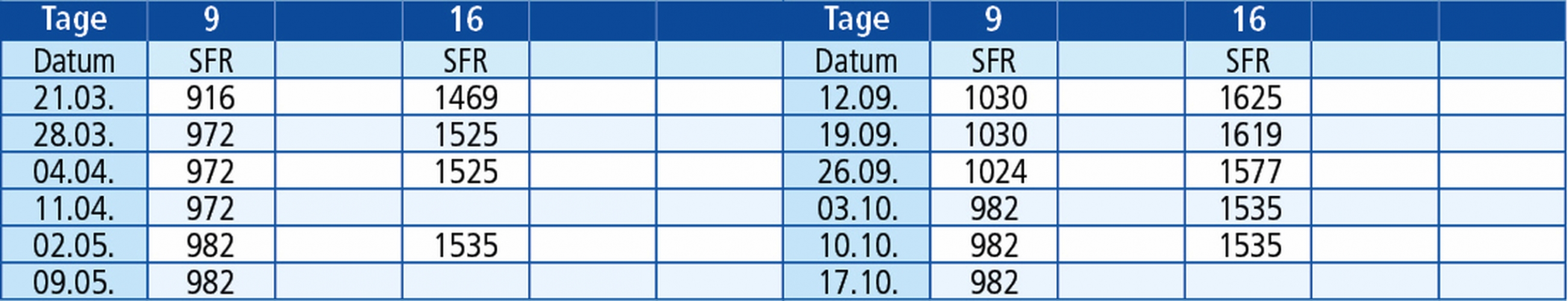 Rückfahrten Sonntag: 29.03. / 05.04. / 12.04. / 03.05. / 10.05. / 17.05. / 20.09. / 27.09. / 04.10. / 11.10. / 18.10. / 25.10. /