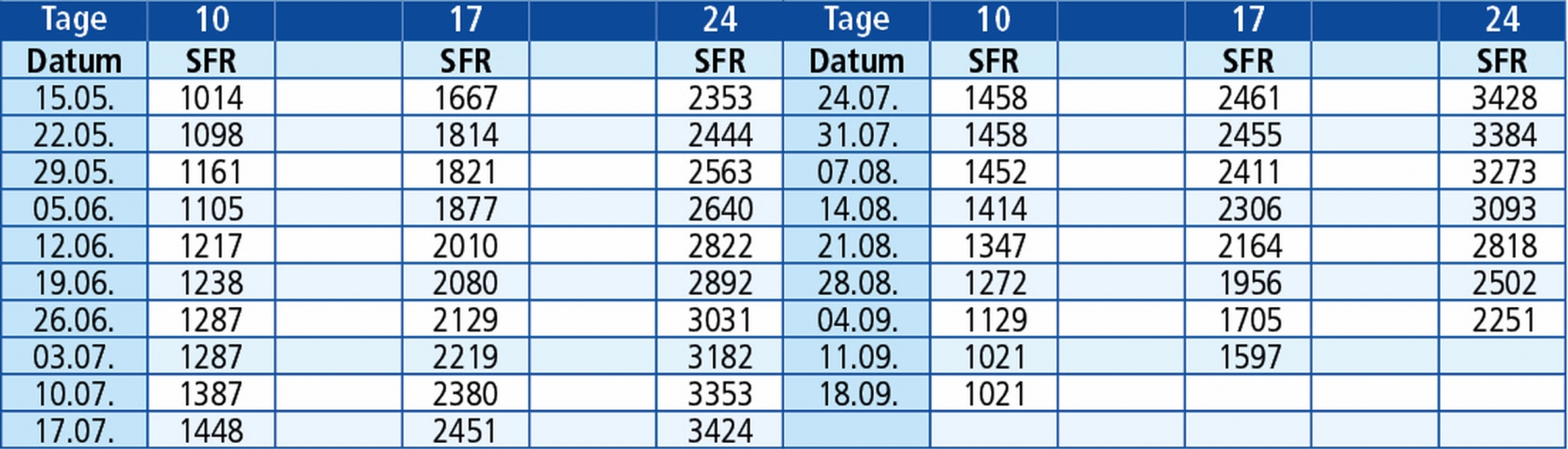 Bei 17 Tage Fahrt = 14 Übernachtungen am Ort, 15 Tage vor Ort, 1 Hin- und Rückreise