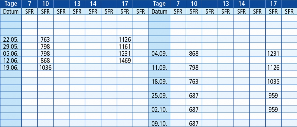 Freitag: 22.05. / 29.05. / 05.06. / 12.06. / 19.06. / 04.09. / 11.09. / 18.09. / 25.09. / 02.10. / 09.10. /