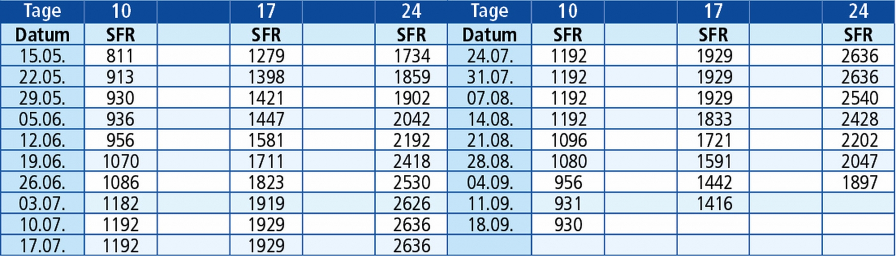 Bei 17 Tage Fahrt = 14 Übernachtungen am Ort, 15 Tage vor Ort, 1 Hin- und Rückreise