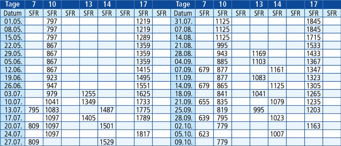 Bei 07 Tage Fahrt = 04 Übernachtungen am Ort, 05 Tage vor Ort, 1 Hin- und Rückreise