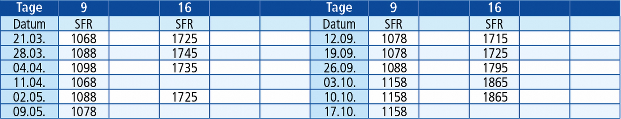 Rückfahrten Sonntag: 29.03. / 05.04. / 12.04. / 03.05. / 10.05. / 17.05. / 20.09. / 27.09. / 04.10. / 11.10. / 18.10. / 25.10. /