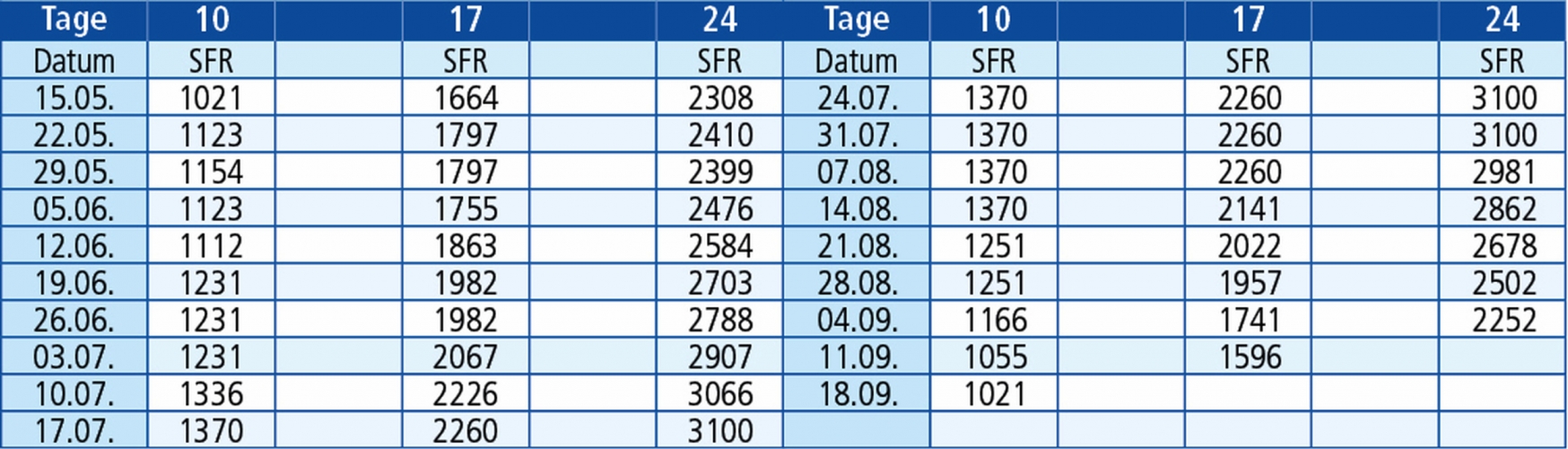 Rechnen Sie die Tage immer mit Abfahrtstag und Ankunftstag, so können Sie ausrechnen wann genau Sie wieder zu Hause ankommen. In den Preisen sind die Anzahl Nächte plus 1 Hin- und 1 Rückreise berechnet. Diese Berechnung gilt für Nachtfahrten.