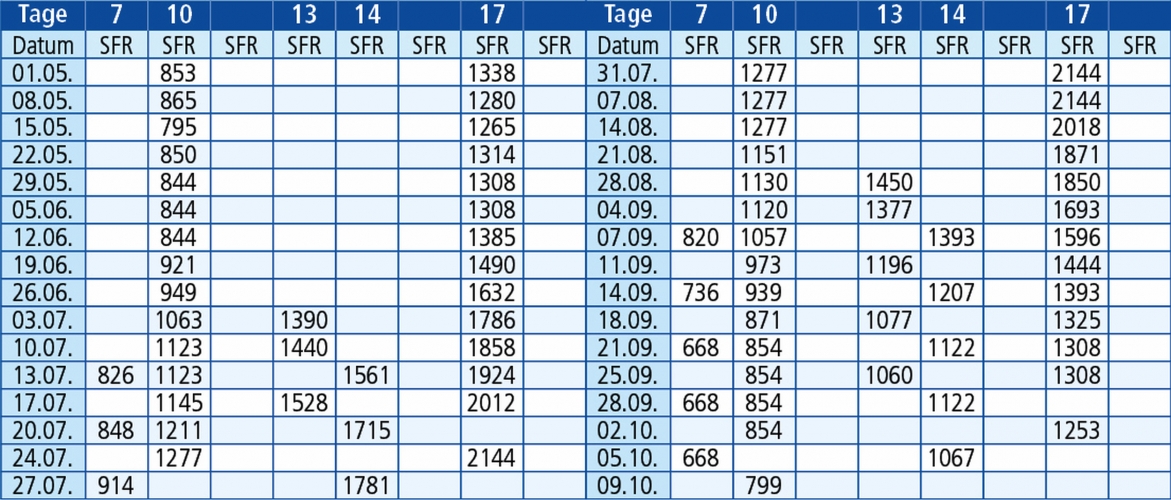 Rechnen Sie die Tage immer mit Abfahrtstag und Ankunftstag, so können Sie ausrechnen wann genau Sie wieder zu Hause ankommen. In den Preisen sind die Anzahl Nächte plus 1 Hin- und 1 Rückreise berechnet. Diese Berechnung gilt für Nachtfahrten.