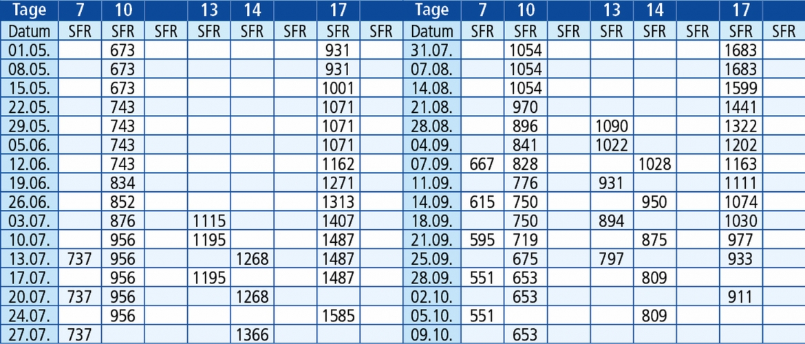 Rechnen Sie die Tage immer mit Abfahrtstag und Ankunftstag, so können Sie ausrechnen wann genau Sie wieder zu Hause ankommen. In den Preisen sind die Anzahl Nächte plus 1 Hin- und 1 Rückreise berechnet. Diese Berechnung gilt für Nachtfahrten.