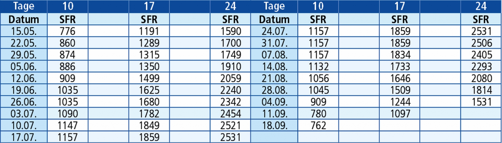 Rechnen Sie die Tage immer mit Abfahrtstag und Ankunftstag, so können Sie ausrechnen wann genau Sie wieder zu Hause ankommen. In den Preisen sind die Anzahl Nächte plus 1 Hin- und 1 Rückreise berechnet. Diese Berechnung gilt für Nachtfahrten.