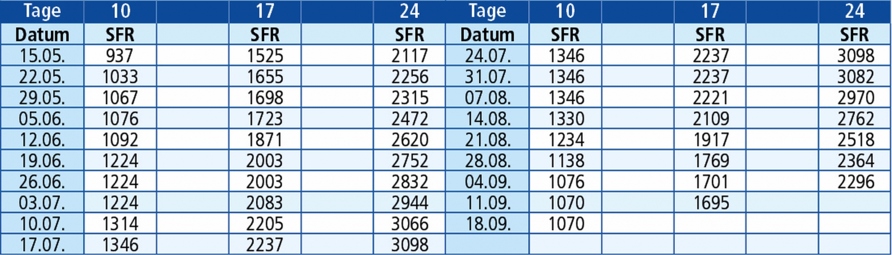 Bei 17 Tage Fahrt = 14 Übernachtungen am Ort, 15 Tage vor Ort, 1 Hin- und Rückreise
